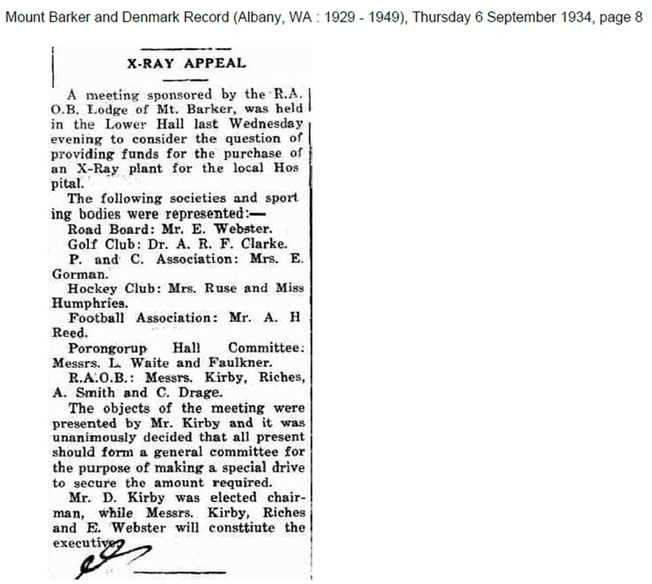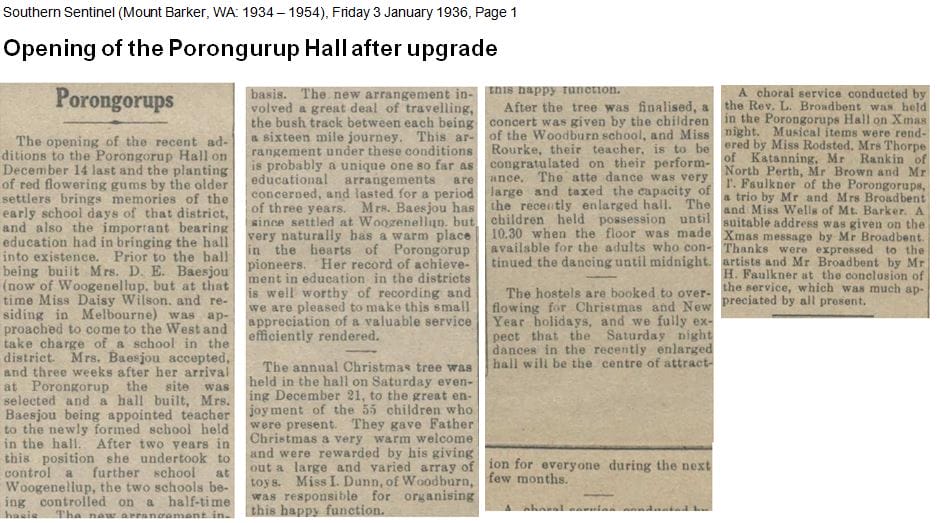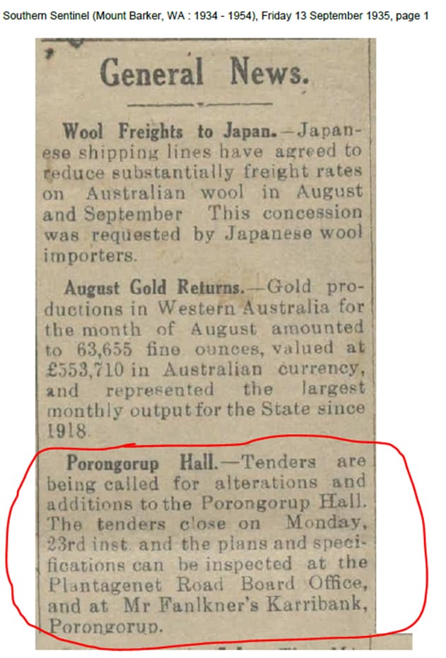 ‘Porongurup Hall: Tenders are being called for the alterations and additions to the Porongurup Hall. The tenders close on Monday 23rd September 1935, and the plans and specifications can be inspected at the Plantagenet Road Board Office, and at Mr Faulkner’s Karribank Porongurup.’ The Southern Sentinel newspaper dated 13 September 1935 on page 1, with the Porongorup Hall call for tenders