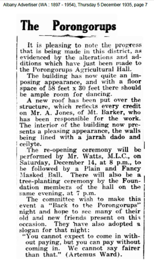 The Porongorups: It is pleasing to note the progress that being made in this district, as evidenced by the alterations and additions which have been made to the Porongurup Agricultural Hall. The building has now quite an imposing appearance, and with a floor space of 58 feet x 30 feet there should be ample room for dancing. A new roof has been put over the structure, which reflects every credit on Mr. A. Jones, of Mt. Barker, who has been responsible for the work. The interior of the building now presents a pleasing appearance, the walls lined with jarrah dado and ceilyte. The re-opening ceremony will be performed by Mr Watts, M.L.C., on Saturday, December 14, at 8 p.m., to be followed by a Plain and Fancy Masked Ball.