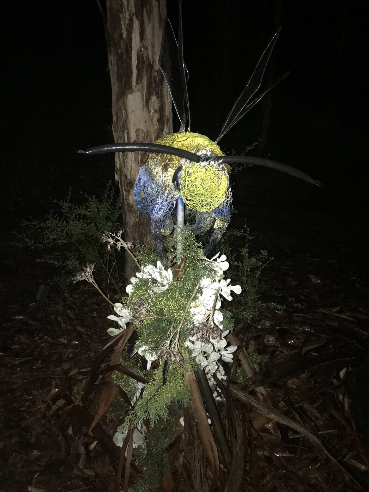 Despite the inclement weather the infamous “Art in the Dark” fund raiser featured on the evening of Friday 14th April. A family friendly evening featured pizza, entertainment by Dave Taylor and his friends, and provided even more entertainment during the torch light tours. These tours take a lighter more humorous interpretation of the art world, especially if you are lucky enough to have Scott Drummond as your guide! The sculptures take on a different form at night, transcending in darkness to reflect shape and form in different aspects. Sue Corke’s Cocoon sculpture shimmered with droplets of rain in the light beam. And Gigi Fogg’s Zuzzlebuzz glistened like an animated wild bee of the night under torch light.