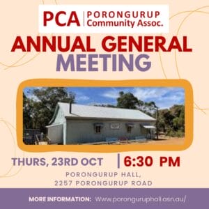 Please join us 6:30pm on Thursday, 23rd of Oct at the Porongurup Hall for our annual general meeting, nominating who will be on the committee.